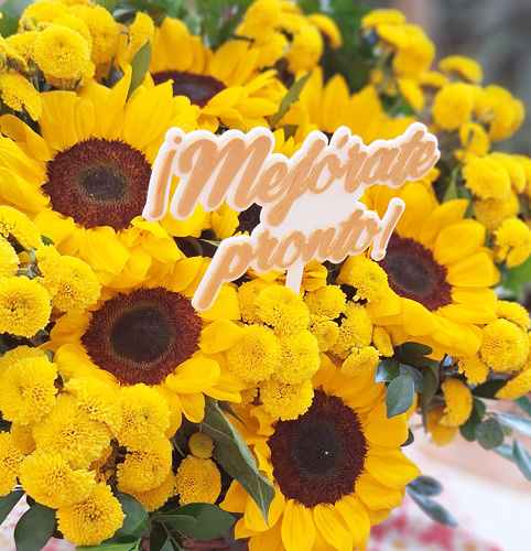 Arreglo floral en cesta de mimbre con girasoles, follaje amarillo y un fino topper con la frase "Mejórate pronto" para desear pronta mejoría su ser querido enfermo o en recuperación. Su arreglo floral puede ser entregado el mismo día, puede hacer su pedido desde la comodidad de su casa u oficina, vía online a través de nuestra web o a nuestro celular o WhatsApp 998271840 a cualquier distrito de Lima. Si desea que en su dedicatoria imprimamos una foto o logo nos la puede enviar a nuestro WhatsApp. Estaremos a su disposición para su consulta o pedido.