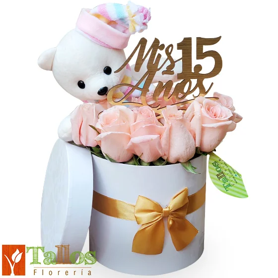 Hermoso y delicado arreglo floral compuesto por rosas rosadas frescas cuidadosamente acomodadas, acompañado de un adorable peluche decorativo y un elegante detalle con la frase “Mis 15 Años”, presentado en una moderna caja tipo box blanca con lazo dorado.