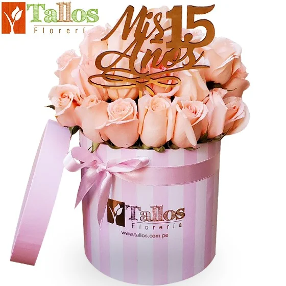 Elegante arreglo floral compuesto por hermosas rosas rosadas frescas cuidadosamente acomodadas, presentado en una delicada caja decorativa tipo box en tonos rosados con lazo, acompañado de un detalle especial con la frase “Mis 15 Años”.