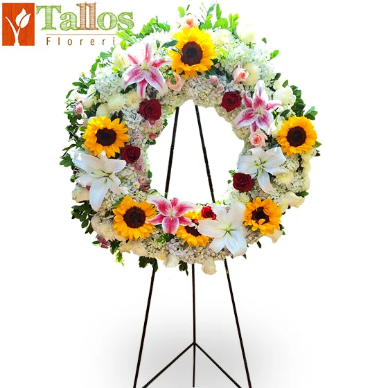 Imponente corona circular para velorios de aproximadamente 1.90 metros de altura, elaborada con rosas de diferentes colores, girasoles, elegantes lirios y abundante follaje, presentada en parantes metálicos resistentes. Un diseño de gran presencia y color, ideal para rendir homenaje y expresar condolencias con respeto en ceremonias y velorios en Lima.