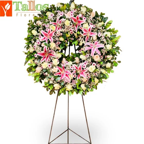 Imponente corona para velorios de aproximadamente 1.90 metros de altura, elaborada con abundantes rosas, finos lirios y colorido follaje decorativo. Un diseño elegante y de gran presencia, ideal para rendir homenaje y expresar condolencias con respeto y distinción en ceremonias y velorios en Lima. El color de las rosas o lirios puede cambiar si el cliente lo solicita.