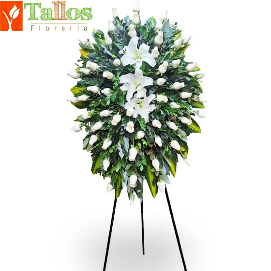 Elegante arreglo floral para funerales elaborado con abundantes rosas blancas, finos lirios y abundante follaje decorativo. Mide aproximadamente 1.90 metros de altura, siendo una opción de gran presencia y solemnidad para rendir homenaje con respeto en velorios y ceremonias en Lima. El color de los lirios puede cambiar si el cliente lo solicita.