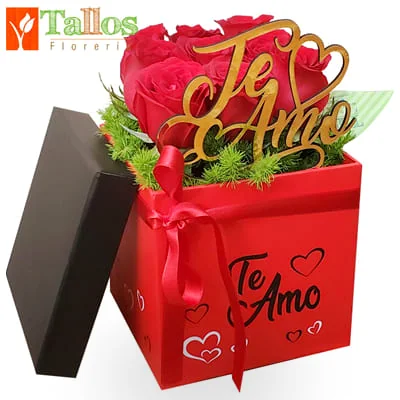 Romántico arreglo floral compuesto por hermosas rosas rojas frescas presentadas en una elegante caja roja decorativa, acompañado de un detalle decorativo con la frase “Te Amo”, ideal para expresar sentimientos de amor de una manera especial.