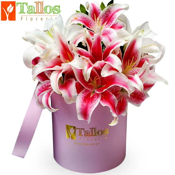 Delicado y elegante arreglo floral compuesto por hermosos lirios rosados y blancos de gran tamaño, cuidadosamente acomodados en una moderna caja decorativa tipo box con lazo dorado.
