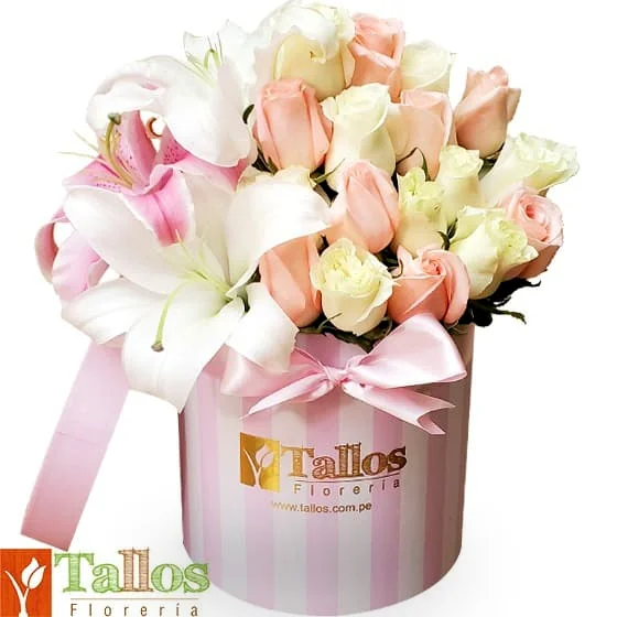 Elegante y delicado arreglo floral compuesto por hermosos lirios blancos y rosados acompañados de finas rosas en tonos pastel, cuidadosamente dispuestos en una moderna caja decorativa tipo box con lazo rosado.