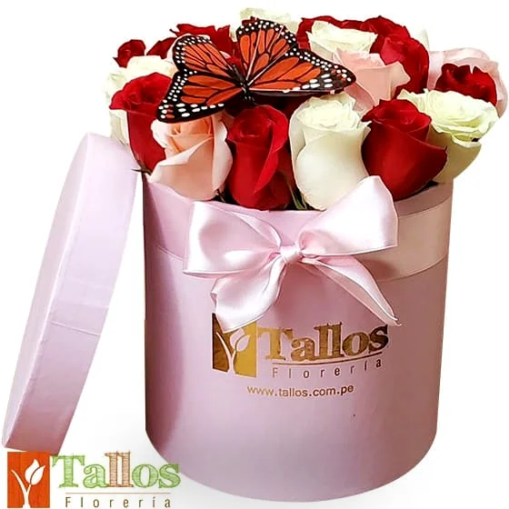 Elegante arreglo floral compuesto por hermosas rosas frescas en tonos rojos, rosados y blancos, cuidadosamente acomodadas en una delicada caja decorativa tipo box rosada con lazo. El arreglo incluye una decorativa mariposa, que aporta un toque romántico y especial al diseño.