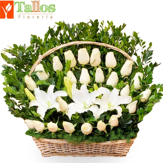 Arreglo floral de aproximadamente 60 cm de altura, presentado en una elegante canasta de mimbre grande con abundantes rosas, finos lirios y follaje decorativo. Un diseño armonioso y respetuoso, ideal para expresar condolencias y acompañar con delicadeza en velorios y ceremonias en Lima.