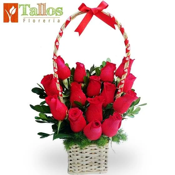 Elegante arreglo floral compuesto por hermosas rosas rojas naturales acompañadas de follaje verde, presentado en una fina canasta de mimbre con asa decorativa y lazo rojo.
