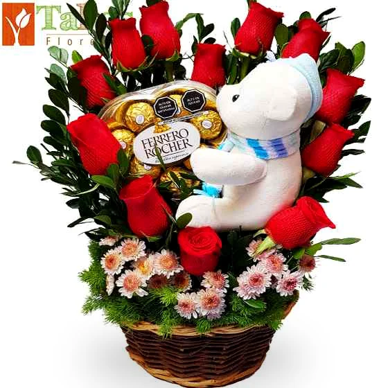 ❤️ Arreglo Floral de Rosas Rojas con Peluche y Ferrero Rocher