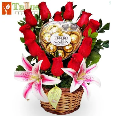 Hermoso arreglo floral compuesto por rosas rojas naturales acompañadas de delicados lirios y abundante follaje verde, presentado en una elegante canasta de mimbre. En el centro incluye una caja de chocolates Princesa de Nestlé en forma de corazón, que contiene deliciosos chocolates rellenos de crema de maní.